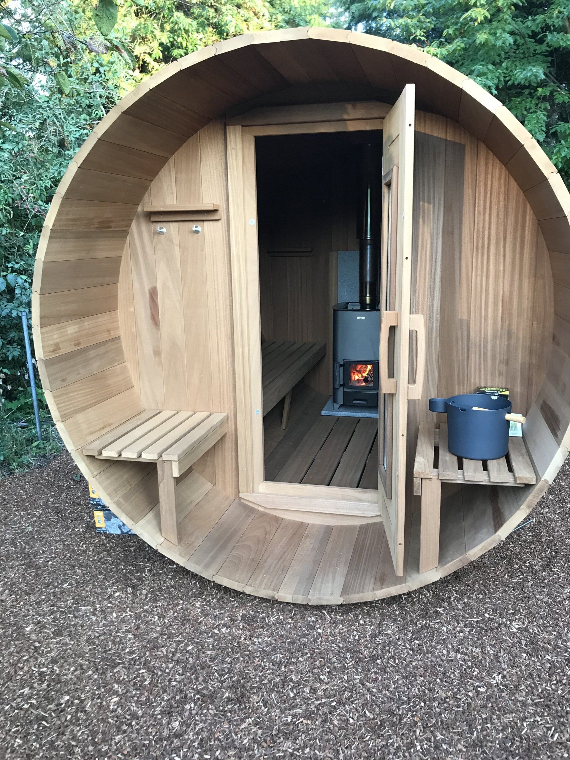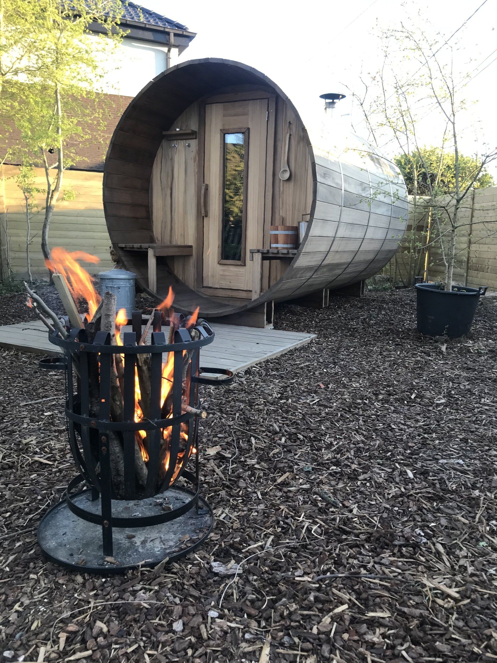 Saunabarrel thermowood 360 cm met terras 60 cm , en gezellig vuurtje