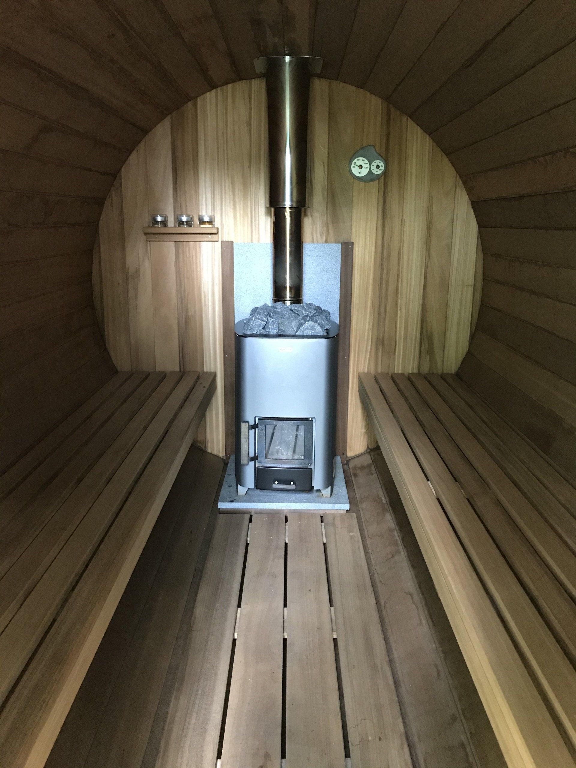 Binnenkant saunabarrel met houtgestookte kachel